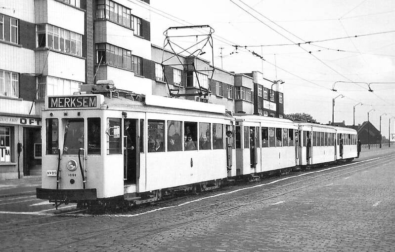 Standaard-motorwagen 10198 sleept de aanhangrijtuigen 19255, 19410 en 19564 op 13 juni 1965 over de Noorderlaan in Antwerpen. De drie aanhangrijtuigen verschillen onderling. Frits van der Gragt organiseerde deze NVBS-uitstap en maakte de foto.
